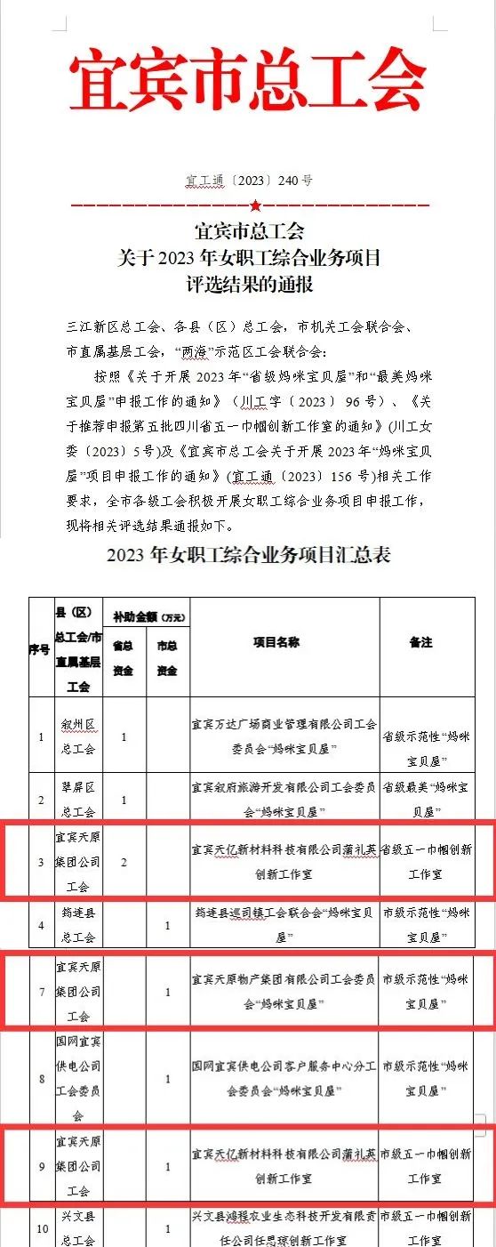 近日,宜賓市總工會公布了2023 年女職工綜合業(yè)務(wù)項目評選結(jié)果,天原集團(tuán)多個項目榜上有名,其中,下屬宜賓天億新材料科技有限公司蒲禮英創(chuàng)新工作室榮獲“省級五一巾幗創(chuàng)新工作室”“市級五一巾幗創(chuàng)新工作室”兩項稱號,下屬宜賓天原物產(chǎn)集團(tuán)有限公司工會委員會“媽咪寶貝屋”榮獲市級示范性“媽咪寶貝屋”稱號。