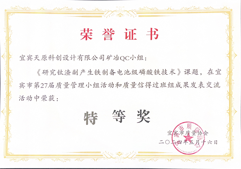 科創(chuàng)設(shè)計公司“研究鈦渣副產(chǎn)生鐵制備電池級磷酸鐵技術(shù)”課題榮獲QC成果“特等獎”