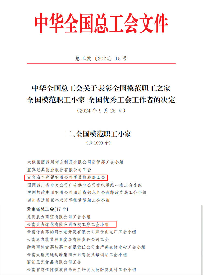 近日,中華全國總工會發(fā)布《中華全國總工會關于表彰全國模范職工之家 全國模范職工小家 全國優(yōu)秀工會工作者的決定》(總工發(fā)〔2024〕15號),集團下屬宜賓海豐和銳有限公司質(zhì)量檢驗部和云南天力煤化有限公司石灰工序2個工會小組喜獲“全國模范職工小家”榮譽稱號。